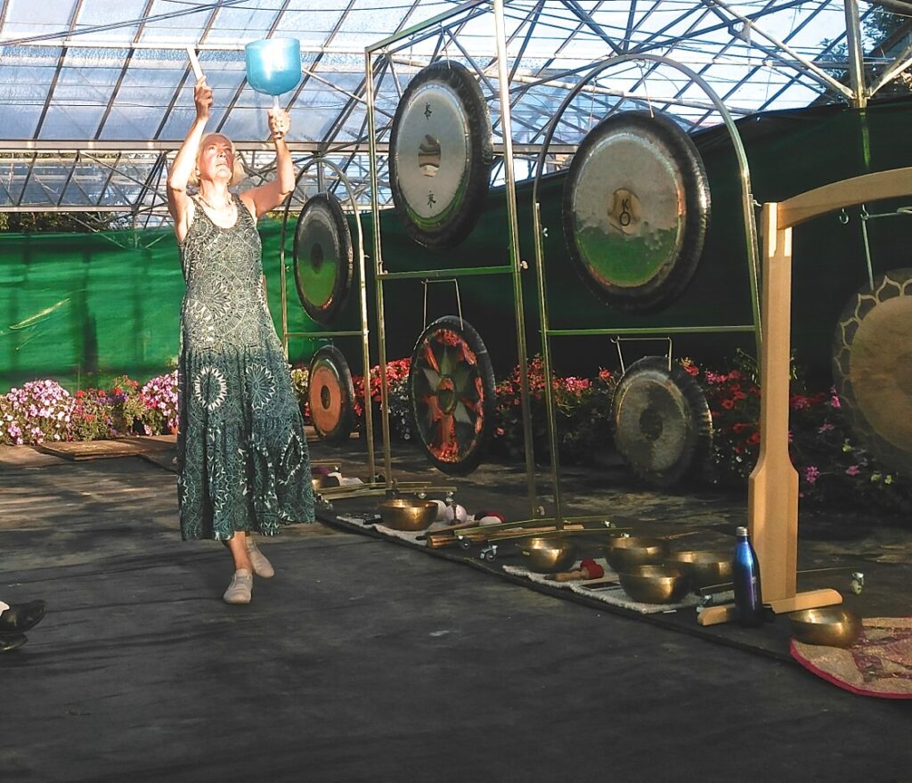 For 50 minutes those of us gathered at Queux Plant Centre  wallowed in a ‘sound bath’ – a sublimely hypnotic experience created by the skills of healing practitioner Sabine Lovelight.  Using a variety of gongs and Himalayan singing bowls, Sabine sent gentle waves of sound over us.  As the reverberations ebbed and flowed we collectively broadcast healing vibrations to a world devastated by the coronavirus pandemic.  ‘It was a wonderful  experience,’  said one member.’ Another commented that it was almost like an orchestra giving our thoughts wings.