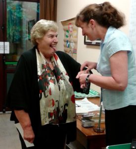 Picture: No, Pam’s not being rude! Sue is checking Pam’s tongue and pulse which helps with diagnosis.